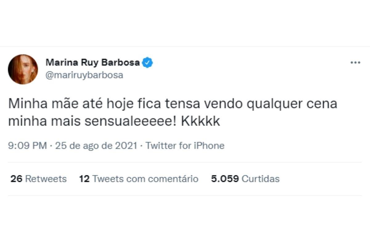 “Minha mãe até hoje fica tensa vendo qualquer cena minha mais sensualeeeee! Kkkkk”, postou Marina no Twitter ainda falando sobre a novela.