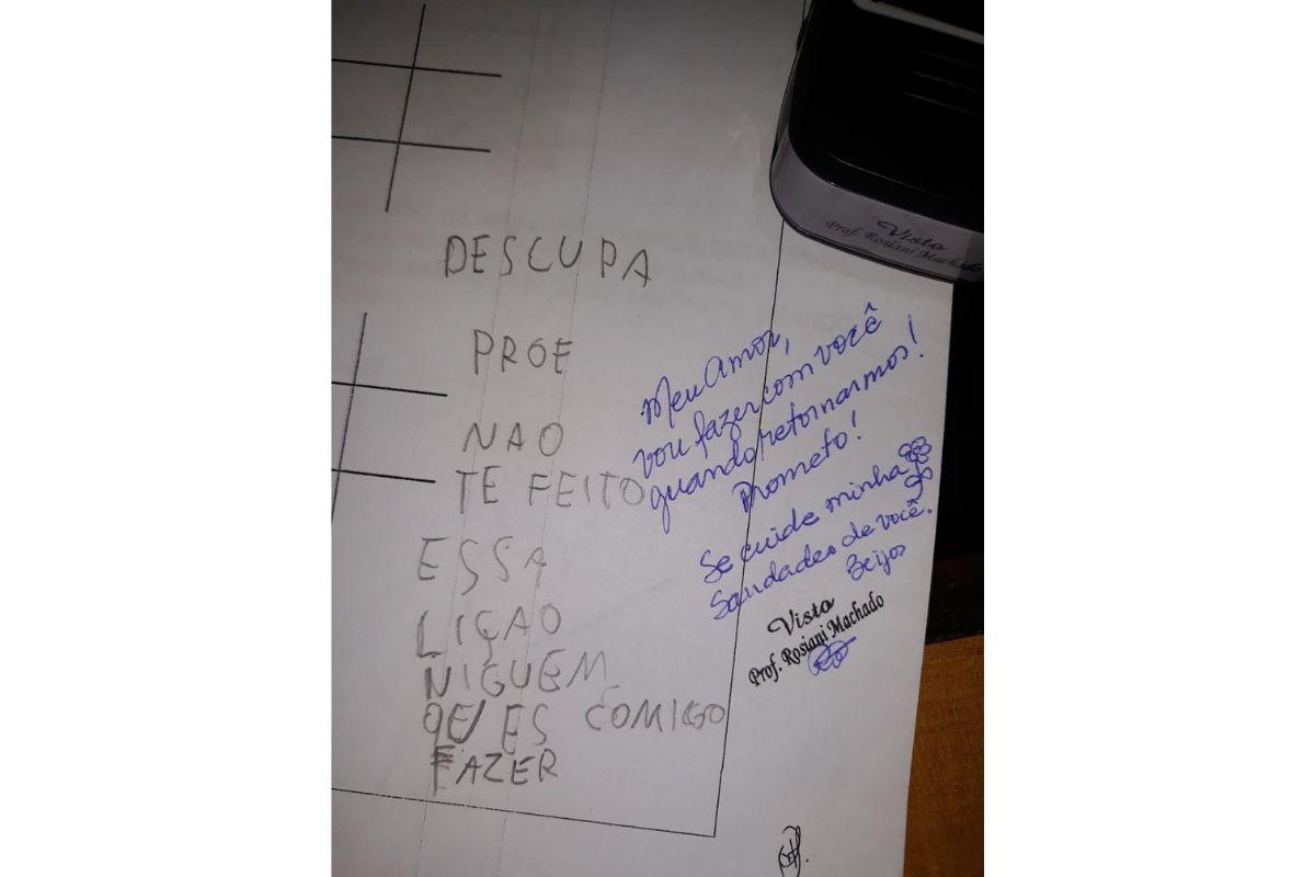 Na mensagem, o menino relata que não fez tarefa, pois não teve ajuda de um responsável. “Desculpa Prof não ter feito essa lição, ninguém quis fazer comigo”, escreveu. Como forma de carinho, a educadora prometeu que na volta das aulas presenciais irá ajudar a criança e pediu para que ela se cuide.