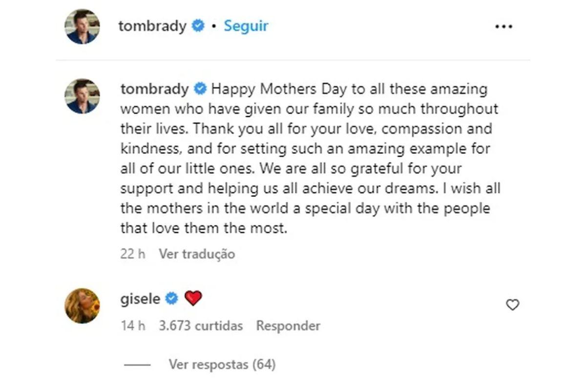 Nos comentários da publicação, Gisele respondeu com um coração vermelho. Fãs também aproveitaram para deixar registrada a torcida pela volta do casal. “Acho que alguém tá querendo reatar o casamento hein?! Cheio de foto da ex aí”, disse um. “Meu Deus, Tom! Faça tudo o que puder para que isso aconteça [reatar o casamento]! Vamos! Você só vive uma vez”, escreveu outro.