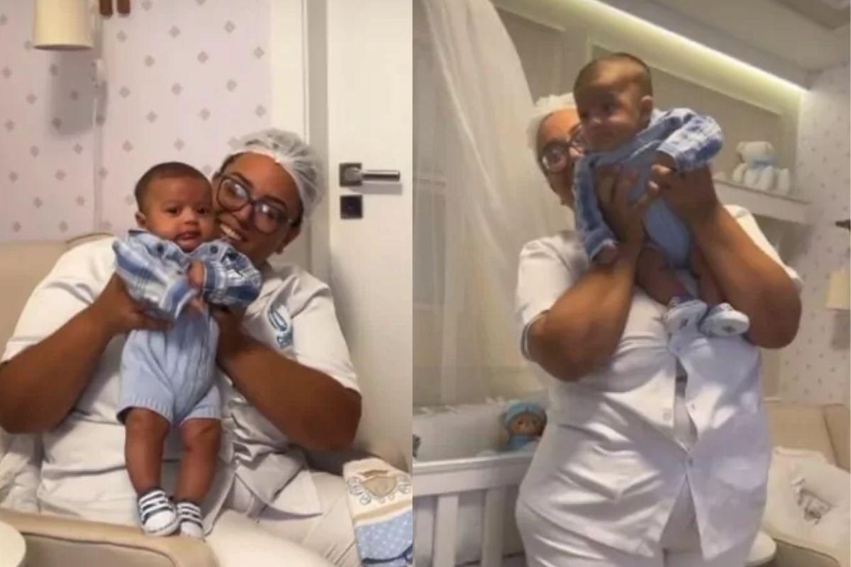 “Me produzi todo para sessão de fotos”, brincou a mãe. Joaquim aparece vestindo uma roupa azul, enquanto a babá brinca com ele. A mulher parece sorridente, e o garoto animado. Já na sequência de stories, ele aparece deitado no berço, todo produzido para a sessão de fotos.