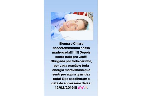 Nasceram na madrugada desta terça-feira (12) as gêmeas Sienna e Chiara, filhas de Fabiana Justus, na 36ª semanas da gestação. A notícia foi dada pela própria empresária em suas redes sociais nesta manhã.