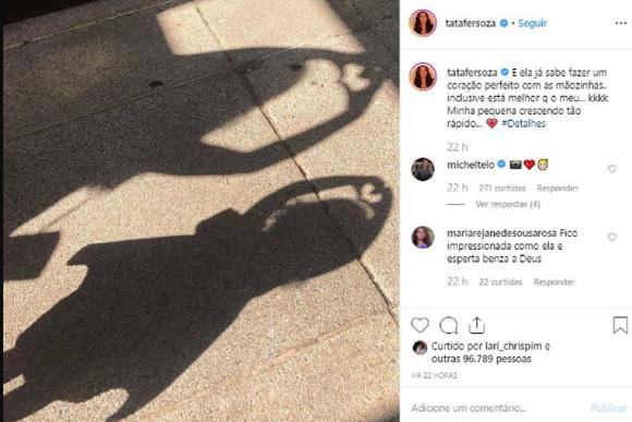 Melinda também não fica para trás no quesito impressionar a mãe. Tata se impressionou com uma habilidade da filha de fazer imagens com a mão. Ela usou o Instagram para mostrar o quão orgulhosa estava da menina. No domingo, 30 de junho, Thais publicou a sombra da menina fazendo coração.