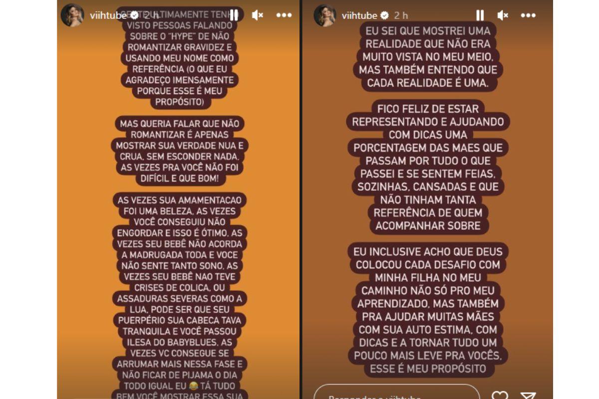 ”Gente ultimamente tenho visto pessoas falando sobre o ‘hype’ de não romatizar gravidez e usando o meu nome como referência (o que eu agradeço imensamente porque esse é o meu propósito) Mas queria falar que não romantizar é apenas mostrar a sua verdade nua e crua, sem esconder nada. Às vezes sua amamentação foi uma beleza você conseguiu não engordar e isso é ótimo. Às vezes seu bebê não teve crises de cólica, ou assaduras severas como a Lua, pode ser que seu puerpério sua cabeça tava tranquila e você passou ilesa do Babyblues. As vezes você consegue se arrumar mais nessa fase e não ficar de pijama o dia todo igual eu e tá tudo bem você mostrar essa sua realidade”, escreveu Viih.