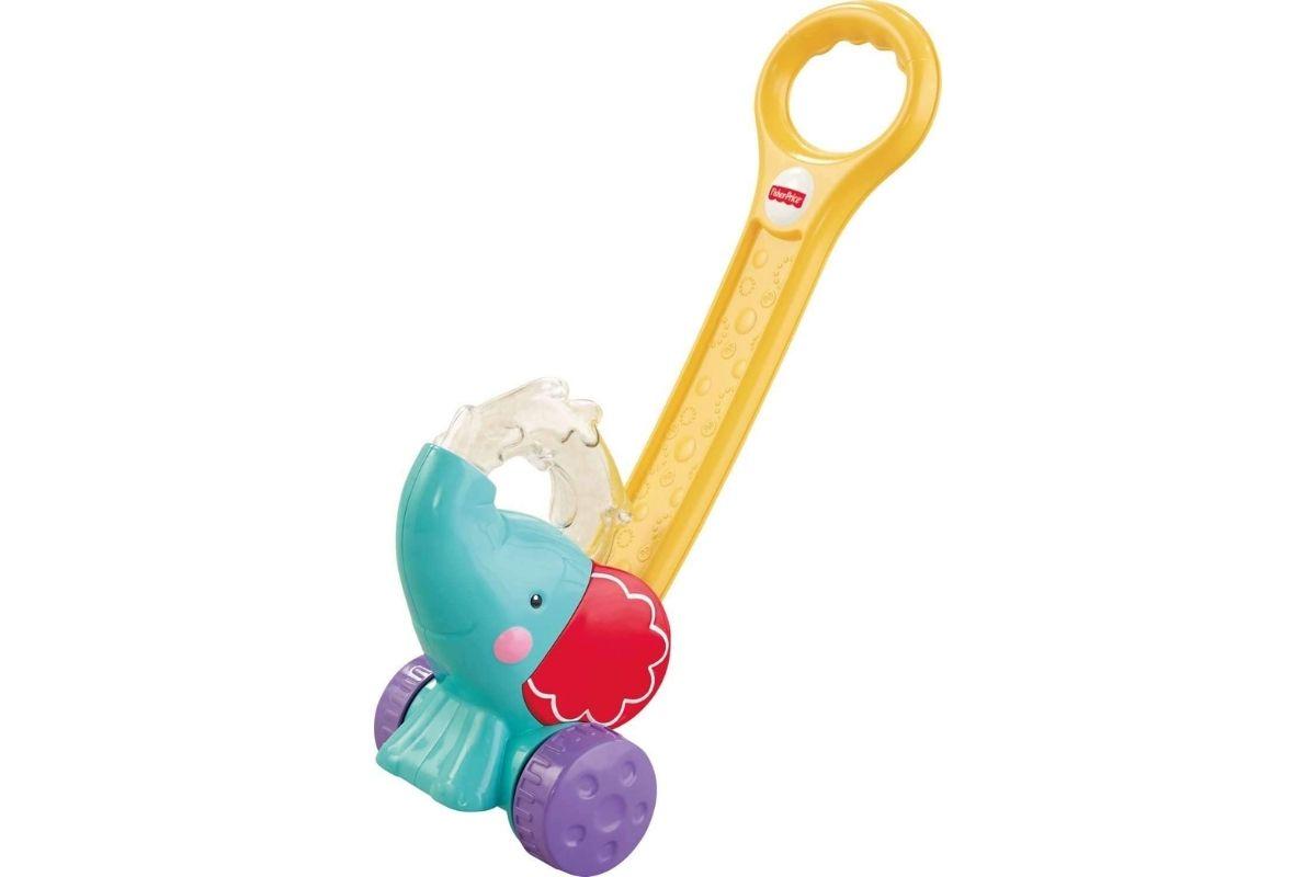 As cores vibrantes e os sons ajudam a estimular os sentidos da criança; ao empurrar o elefante, bolinhas coloridas chacoalham sem parar – incentivando o desenvolvimento da coordenação motora e do equilíbrio.