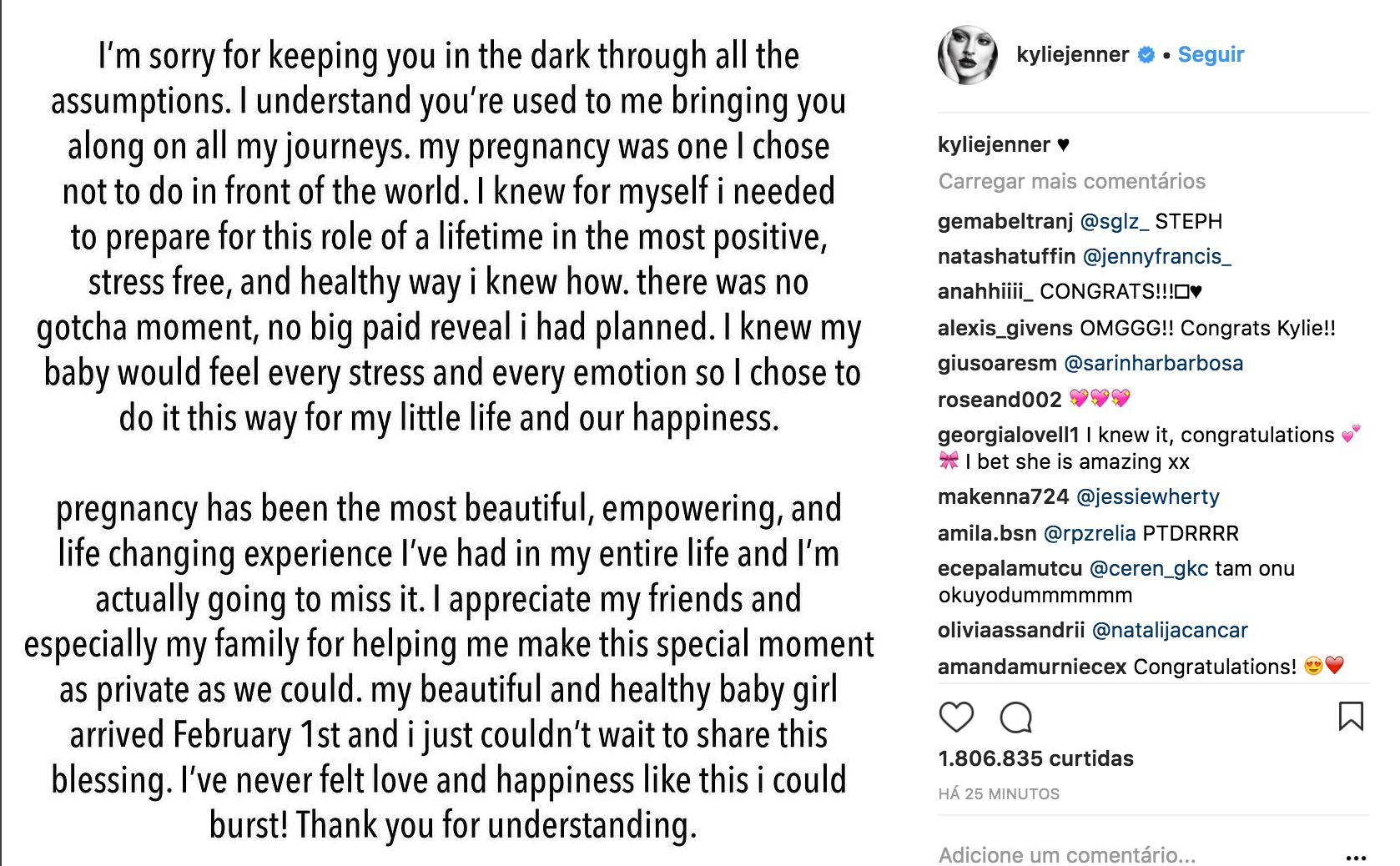 A influenciadora mais famosa das redes sociais, Kylie Jenner, acaba de postar em seu Instagram que nasceu sua filha, no dia 1 de fevereiro. Ou seja, todos os boatos se confirmaram. Ela estava, sim, grávida durante esse tempo ausente das câmeras.