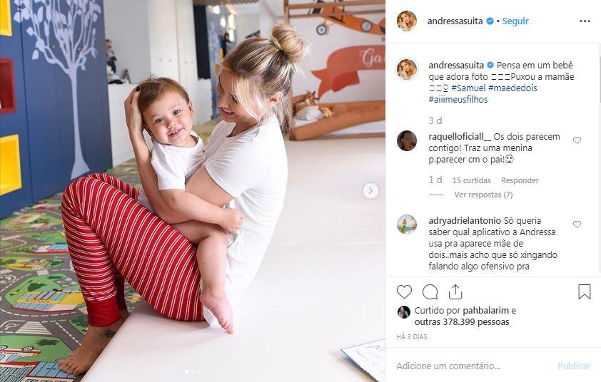 “Pensa em um bebê que adora foto. Puxou a mamãe“, brincou a modelo. Além de Samuel, Andressa Suita é mãe de Gabriel, de 2 anos, ambos são frutos de seu casamento com o cantor sertanejo Gusttavo Lima.