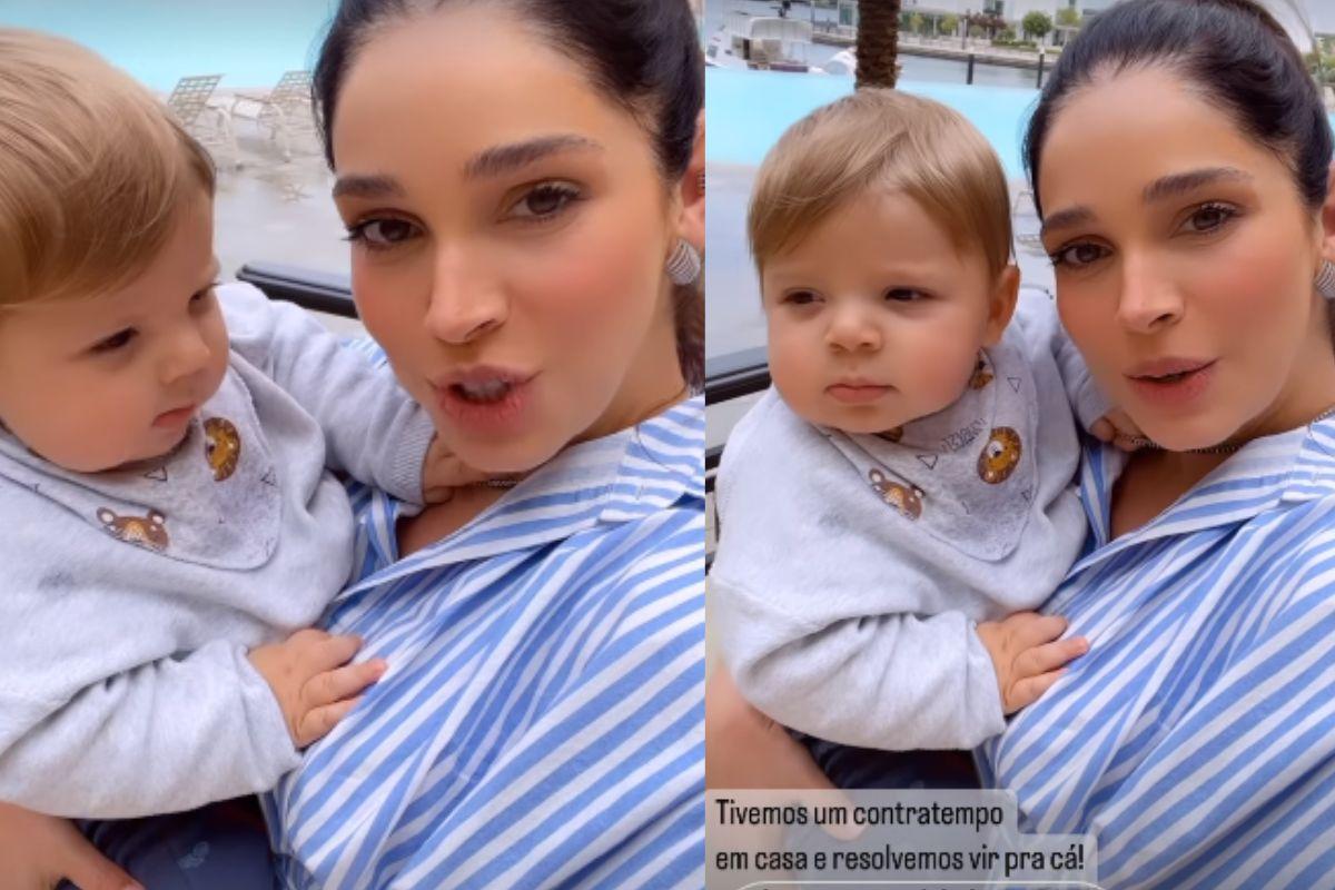 “Estou aqui dando uma voltinha com o Leo no hotel aqui em Dubai, receberam a gente super bem enquanto a nossa casa fica pronta. Pena que está chovendo, porque olha essa piscina, o Gael ficou enlouquecido. Vou sentar para dar o almoço do Leo, o Gael está com o vovô na sala de jogos, se divertindo um pouquinho”, disse a mãe no vídeo.