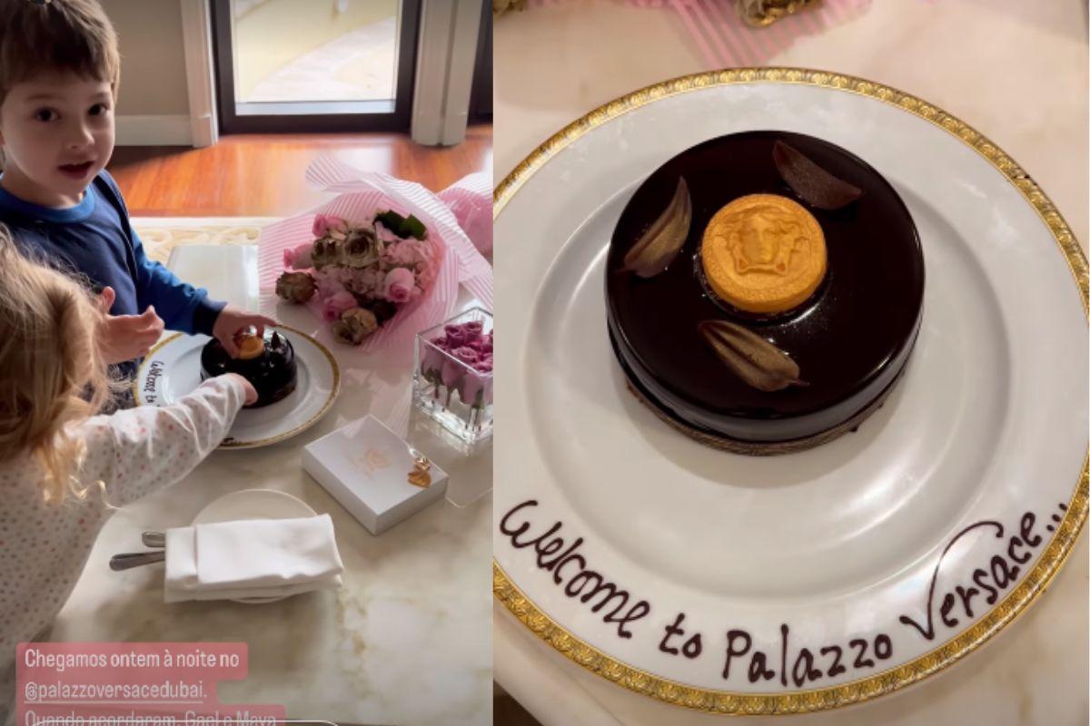 Nos Stories ela gravou a reação dos filhos mais velhos, Gael e Maya ao ganharem um bolo de presente do hotel. “E Maya está com a vovó no lobby do hotel. Ela não consegue sair de lá, porque tem uma moça tocando violino e ela está apaixonada, aplaude a moça. Espero que a avó tenha gravado um vídeo para postar aqui”, ela falou na gravação.