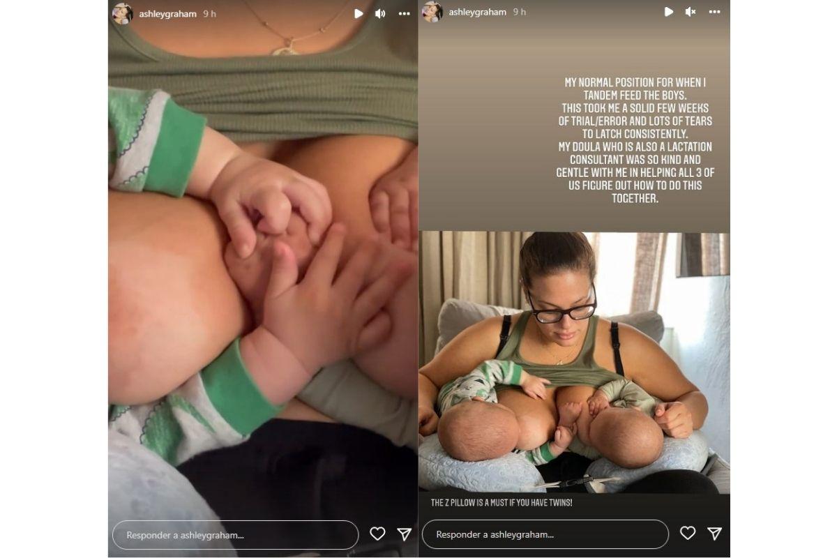 Ashley Graham é uma modelo americana plus size famosa, e deu à luz gêmeos em janeiro deste ano. Hoje ela emocionou os fãs com um vídeo amamentando os filhos gêmeos, Malachi e Roman, de mãos dadas, a cena é realmente emocionante. A modelo também é mãe de Isaac de 1 ano.