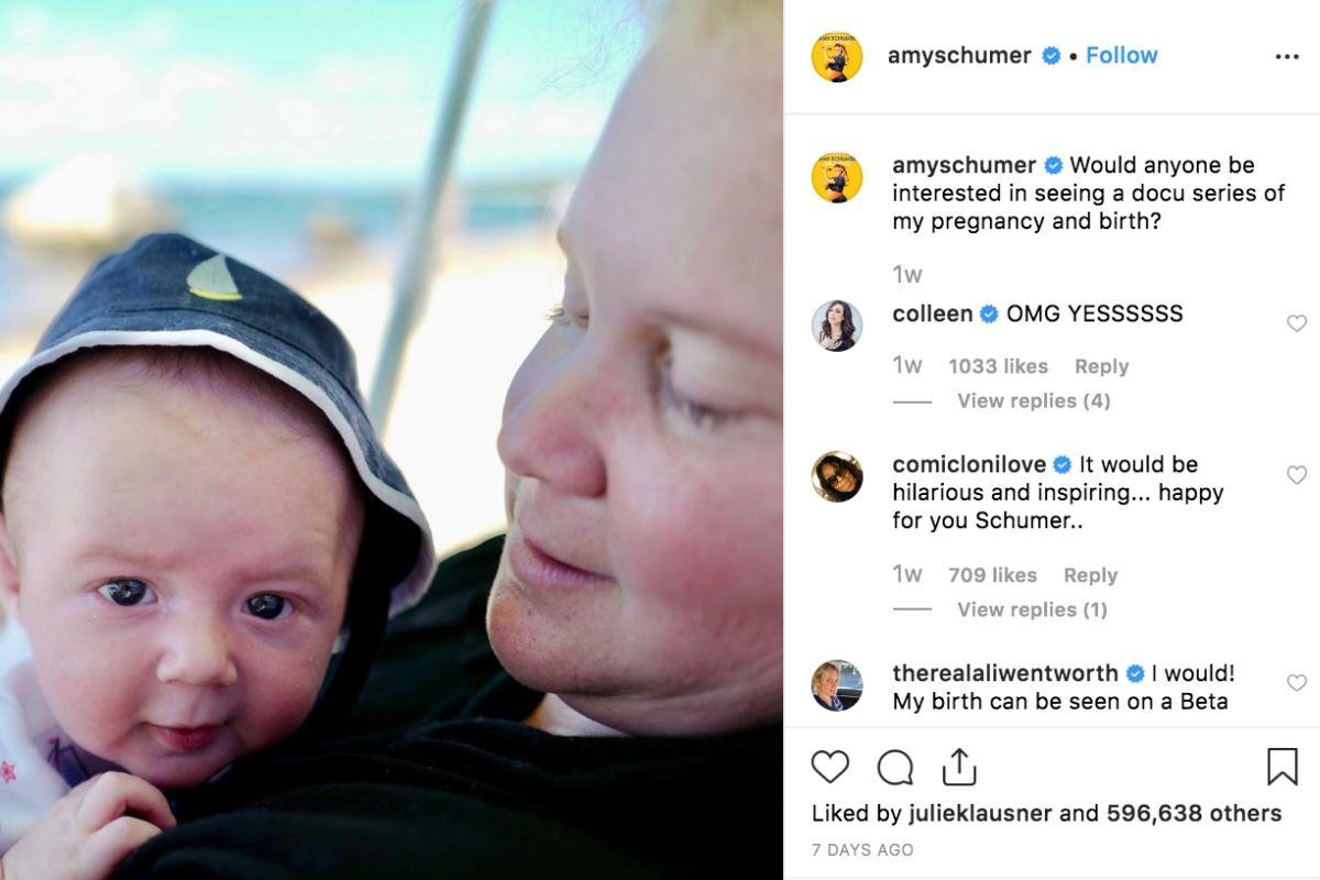 A comediante Amy Schumer publicou na segunda-feira, 12 de agosto, uma foto com o seu bebê no colo e perguntou se os seus seguidores gostariam de assistir um documentário sobre a sua gravidez e parto. Além de ter conquistado muitos elogios de seus fãs, um comentário em específico chamou a atenção da atriz e a resposta foi maravilhosa.