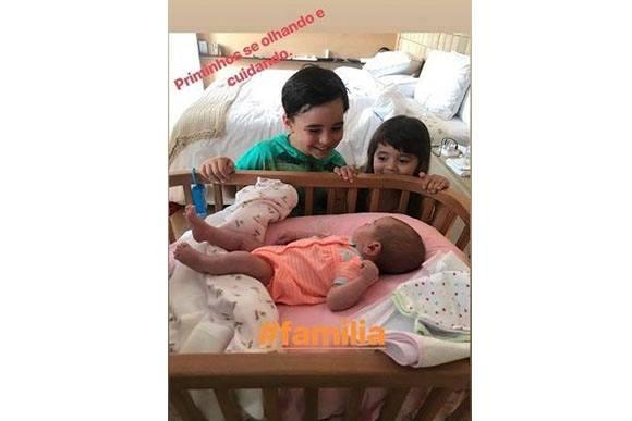 Os pequenos foram com a mãe conhecer a priminha Zoe no apartamento que Sabrina divide com o marido Duda Nagle. O momento foi registrado no Story da apresentadora que mostrou que tanto a titia Karina quanto Manuela e Felipe estavam fascinados pela neném.