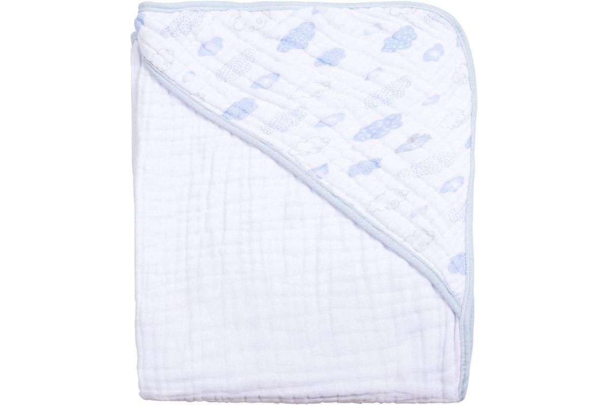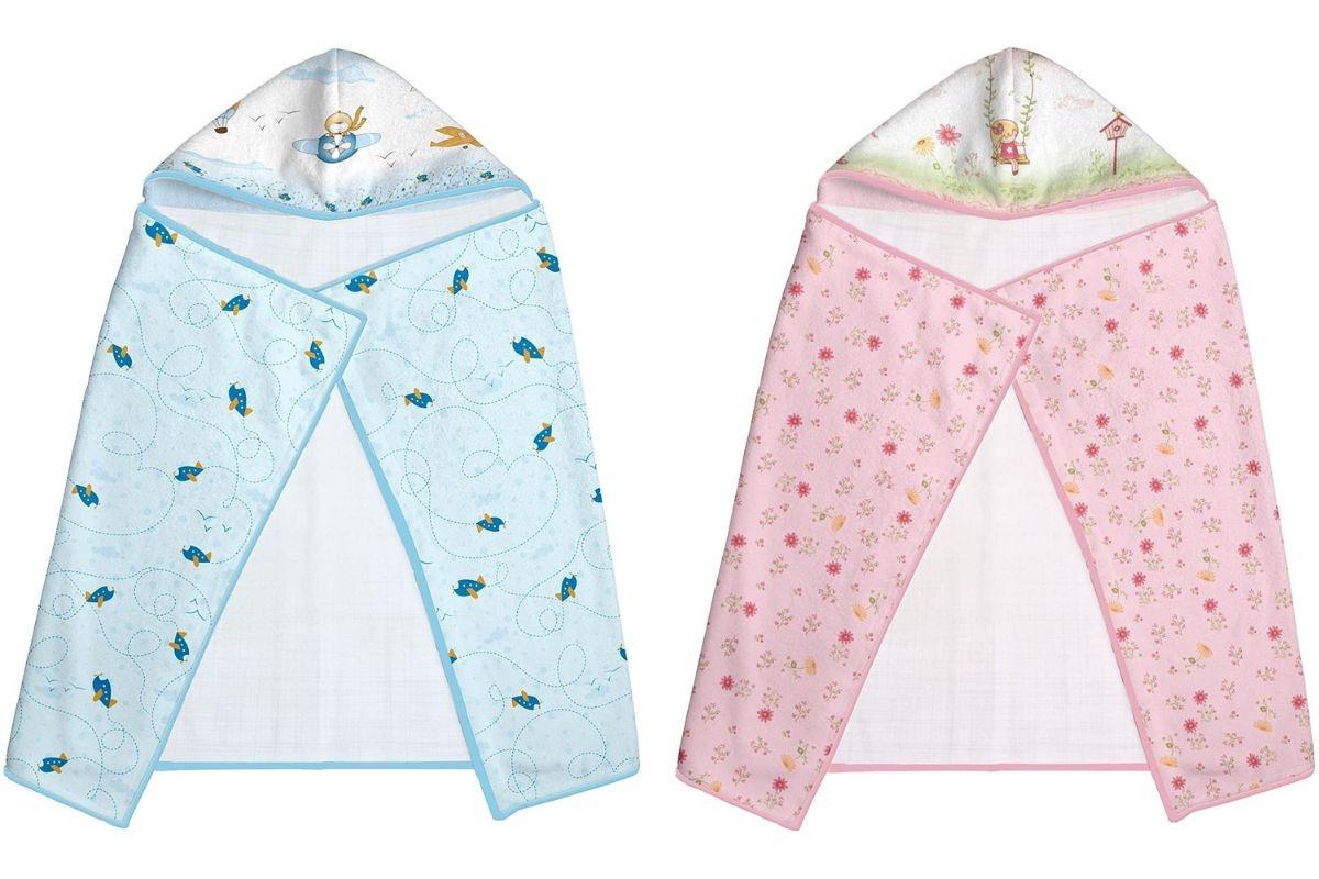 Super macia, sendo feita com três camadas de tecido fralda 100% algodão com acabamento em viés de malha e capuz centralizado. Vem em várias opções de estampa.