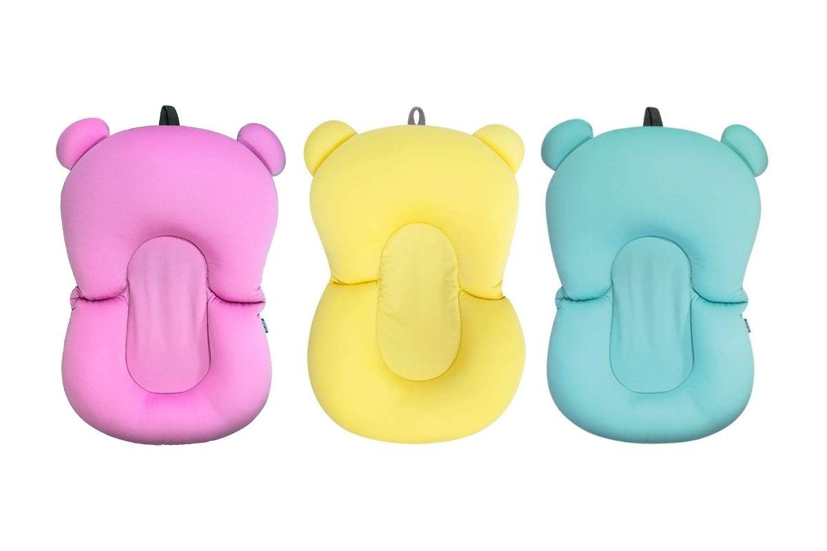 Se encaixa perfeitamente na banheira graças ao seu formato anatômico, deixando o bebê confortável e seguro, com a cabeça para fora da água. Composto por 92% poliéster, 8% elastano e poliestireno. Vem nas cores rosa, amarelo e azul.