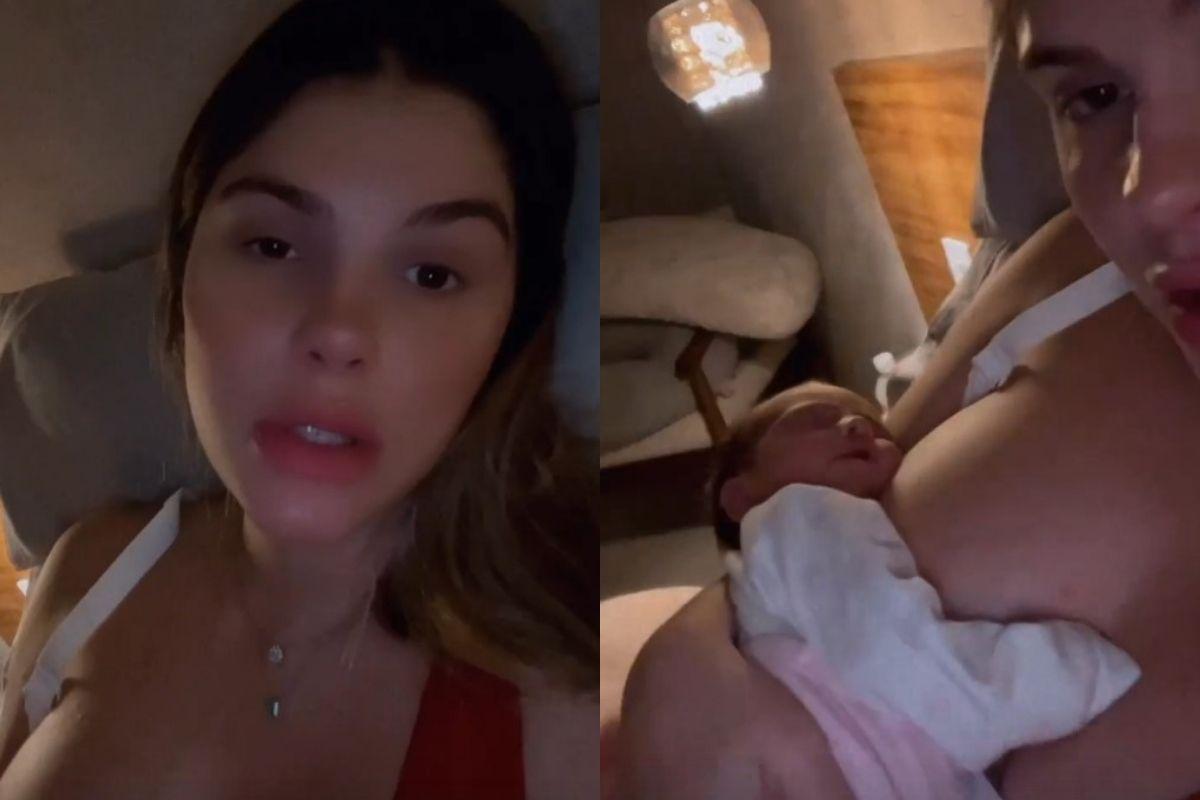 “Bom dia, minha gente, essa noite foi tensa. A Ayla ficou super estressada, irritada com o ducto entupido. Muito. Vocês não tem noção. Foi de partir o coração. Ela chora e eu choro junto. Nossa, ela passou a noite toda no peito comigo. Já fiz a massagem, a médica já olhou e está tudo certo, não é conjuntivite. Vocês me falaram que demora para passar né. Amanhã teria foto de recém-nascido, mas desse jeito não vai dar”, começou ela.