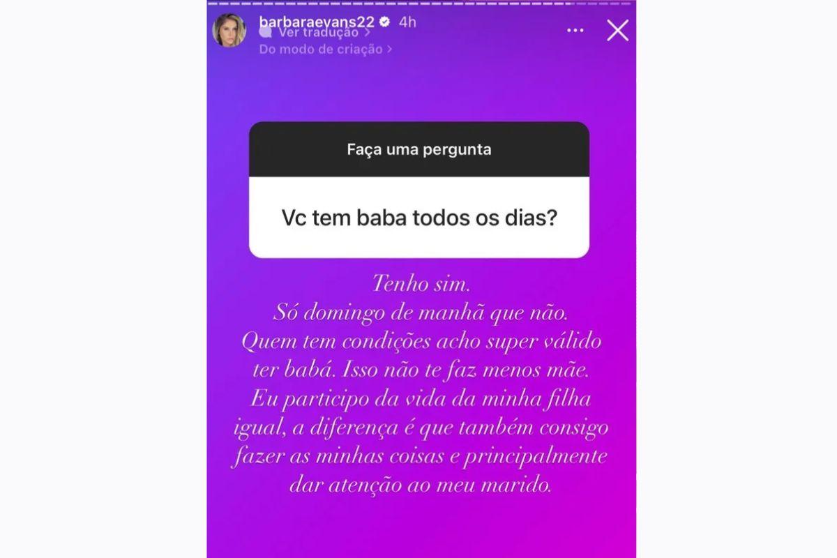 Em uma caixa de perguntas na sessão de stories, um seguidor perguntou: “Você tem babá todos os dias?”. Em resposta, Bárbara colocou: “Tenho sim. Só domingo de manhã que não. Quem tem condições [de pagar], acho super válido ter babá. Isso não te faz menos mãe. Participo da vida da minha filha igual, a diferença é que também consigo fazer as minhas coisas e, principalmente, dar atenção ao meu marido”, disse sincera.
