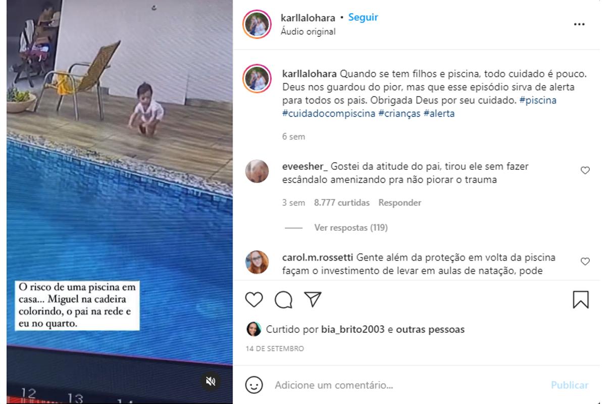 “Quando se tem filhos e piscina, todo cuidado é pouco. Deus nos guardou do pior, mas que esse episódio sirva de alerta para todos os pais”, escreveu a mãe, na legenda do post. Karlla conta que a família estava na piscina quando começou a chover e todos saíram da água. Ela levou Bella para tomar banho enquanto o pai da menina Cleyton Alves Pinto, de 38 anos, e o filho mais velho, Miguel, de 5 anos, ficaram na área de lazer. “Para ter acesso à piscina, tem uma porta de vidro que costuma ficar fechada, mas naquele dia o Miguel havia passado e a deixou aberta. O Cleyton acreditava que a Bella estava comigo no quarto e não viu ela passando pela área de lazer. Foi um segundo de distração e tudo aconteceu”, recorda a mãe.