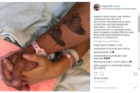 “Como da primeira vez, com a Vicky, não poderia deixar que a primeira foto não fosse postada pela Bella”, escreveu Maguila. Então, ficamos esperando a primeira imagem da nova integrante da família sair no Instagram da blogueira, que tem mais de 3 milhões de seguidores no Instagram. “Cheguei no Hospital com 5cm de dilatação […] Gritei tanto, mas tanto que devo ter acordado todos os bebês do hospital. Não teve jeito – tive que abrir mão do meu sonho e aceitei a anestesia“, escreveu Bella. Leia o relato na íntegra: