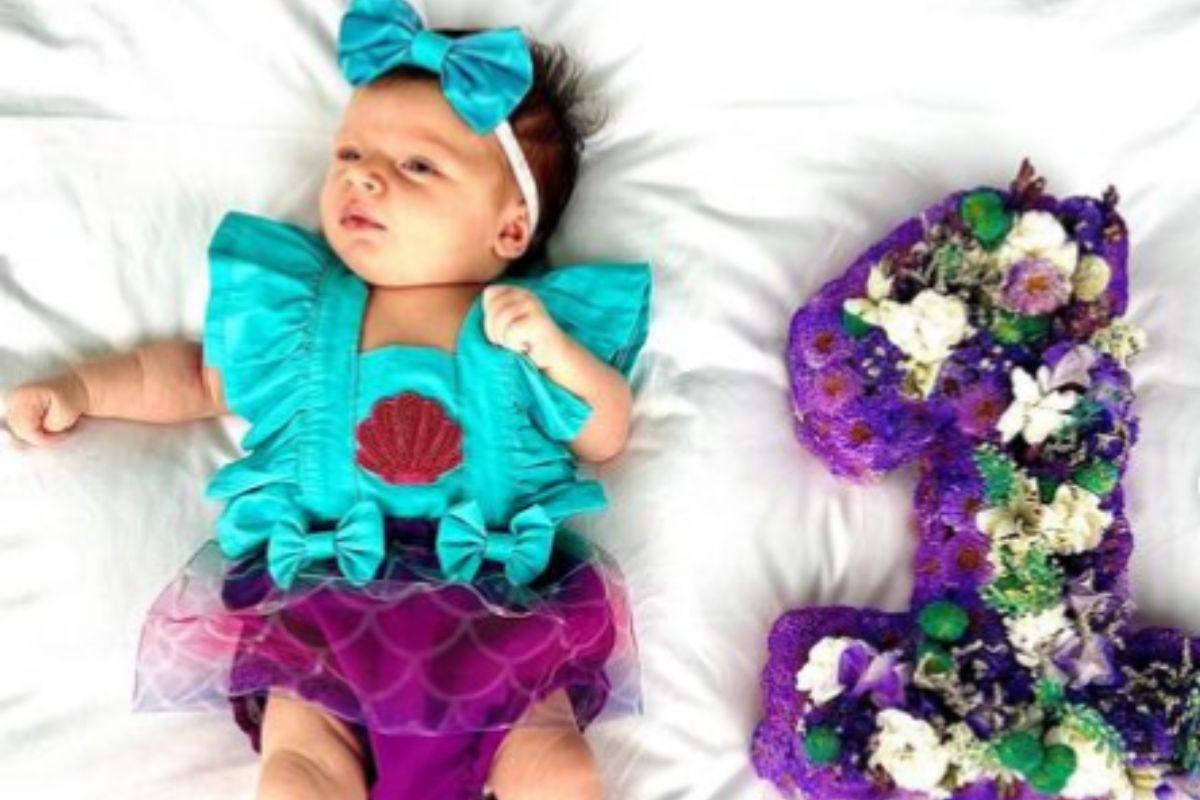 Nas imagens a bebê aparece usando uma fantasia de sereia ao lado de um buquê de rosa em formato do número 1.
