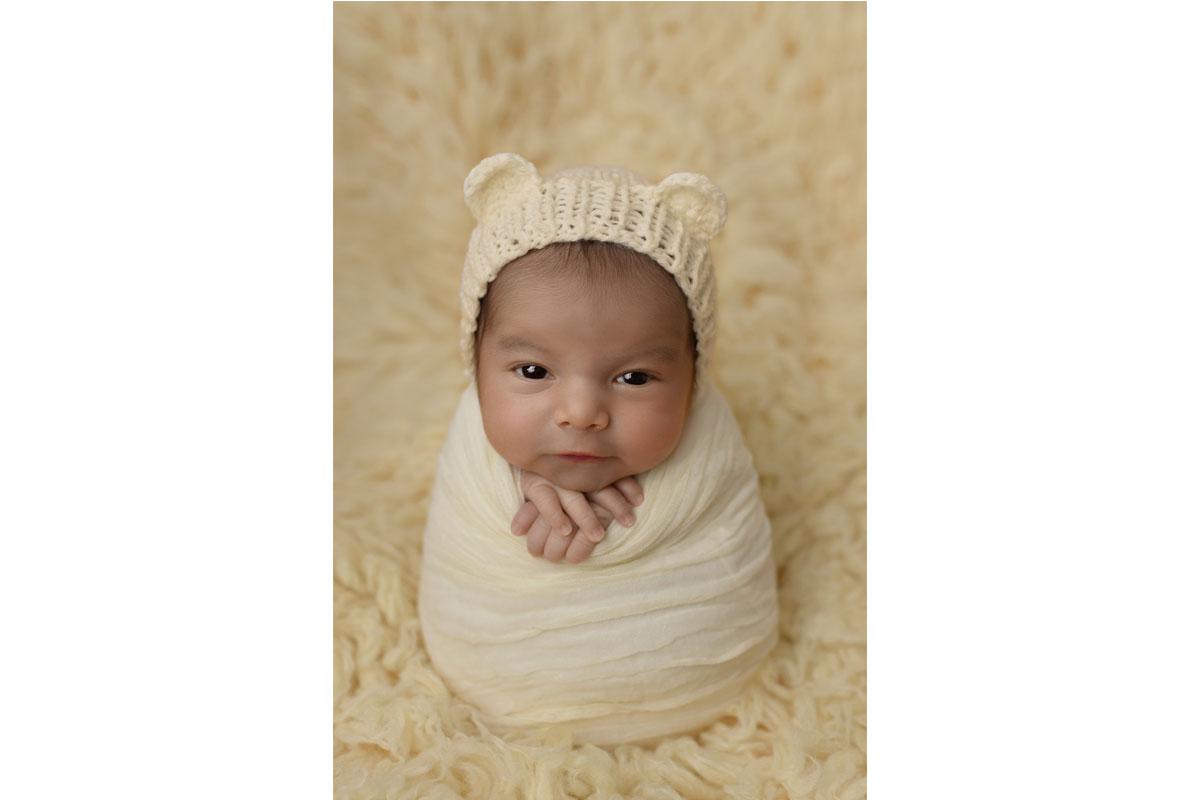Ele adiantou em dois dias a data do nascimento e veio ao mundo com 50 cm e 3kg e 530 gramas. Jade e Bruno escolheram um ensaio com cores neutras e clássico, com fotos do Zion dormindo, enrolado em matas, dentro de cestos e no colo dos pais.