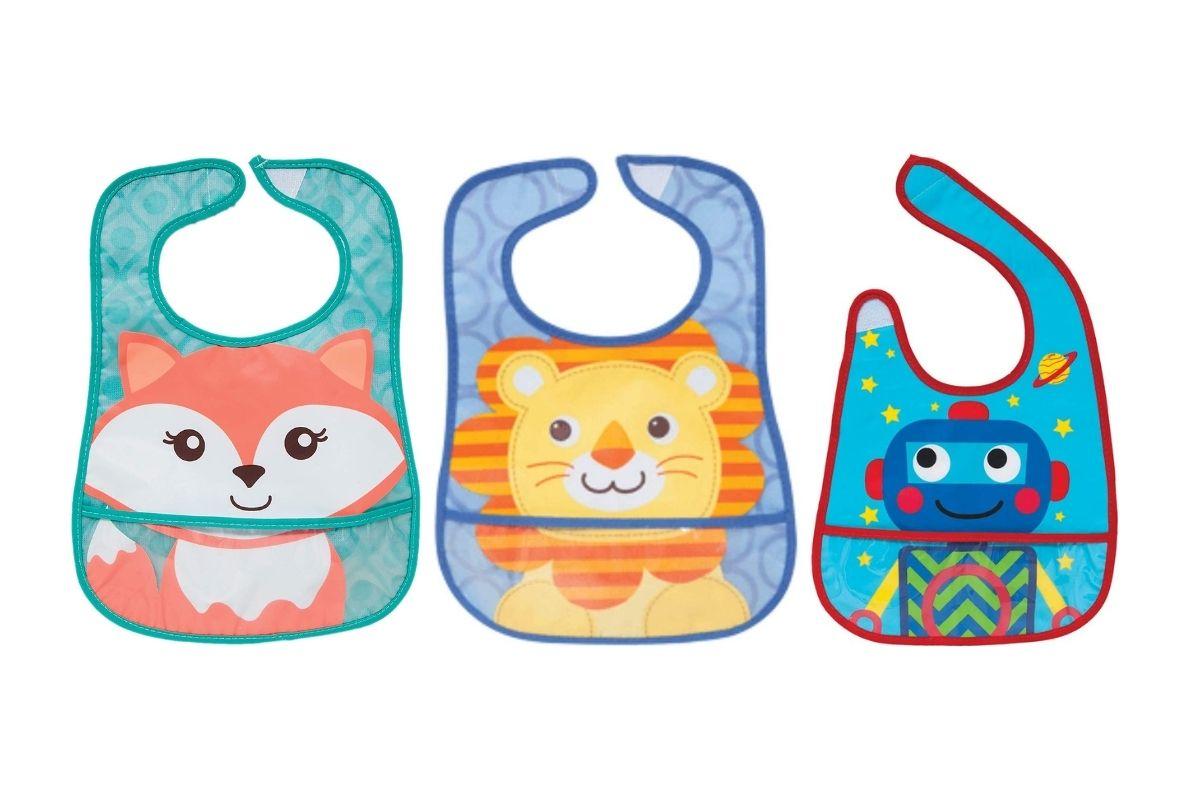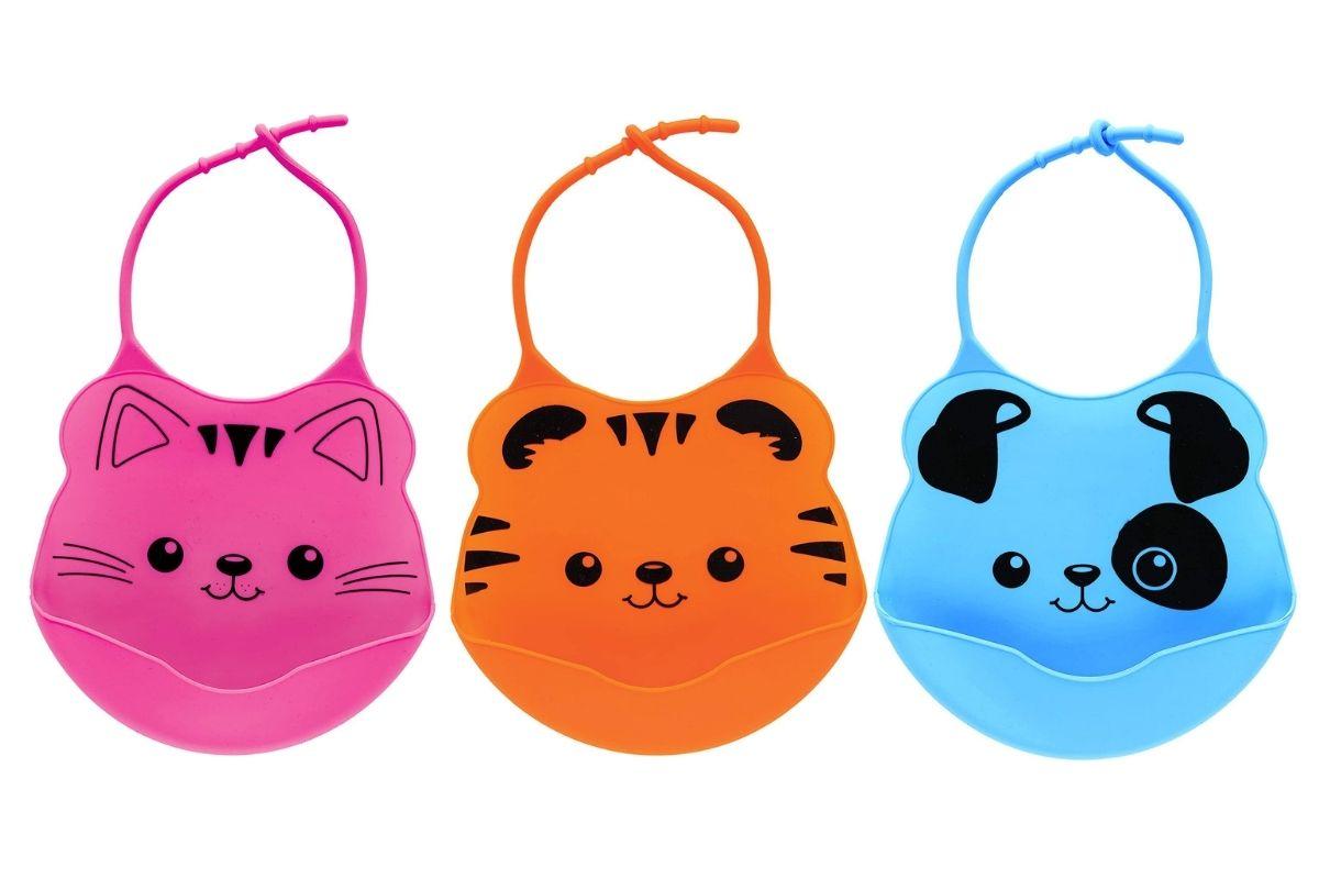 Feito em silicone, possui um bolso frontal para segurar os pedaços de comida que cair e fecho com diferentes níveis para melhor ajuste.