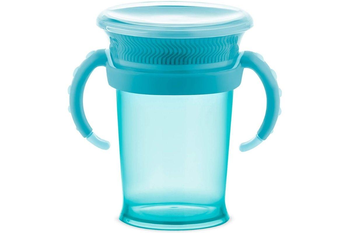 Com bocal e abertura mais rígidos, esse copo auxilia na transição para um convencional. Possui a cintura mais estreita e com textura antideslizante, sendo mais fácil para os bebês segurarem.