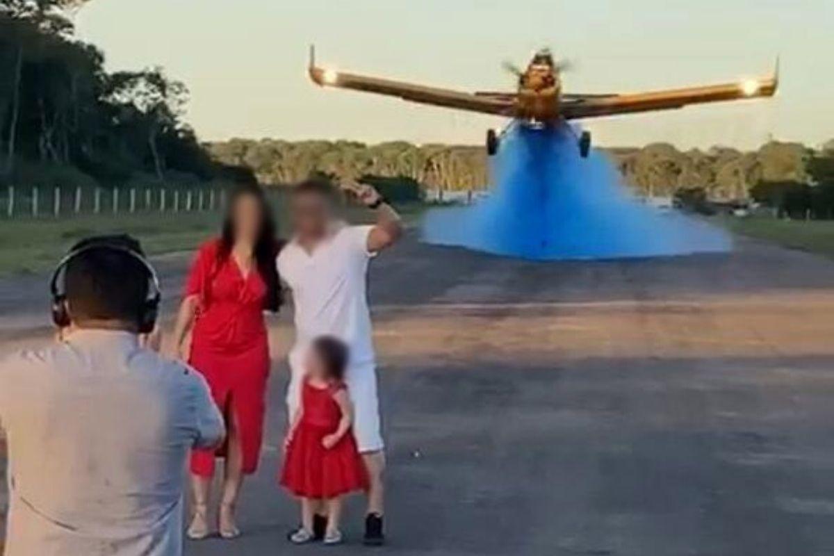 Para garantir uma boa lembrança do momento, o casal contratou fotógrafo e um cameraman para eternizar o momento na pista do aeroporto, junto da filha mais nova e de familiares e amigos. O resultado foi tão incrível quanto o esperado e o avião soltou um líquido azul para anunciar a vinda de um menino para a família.
