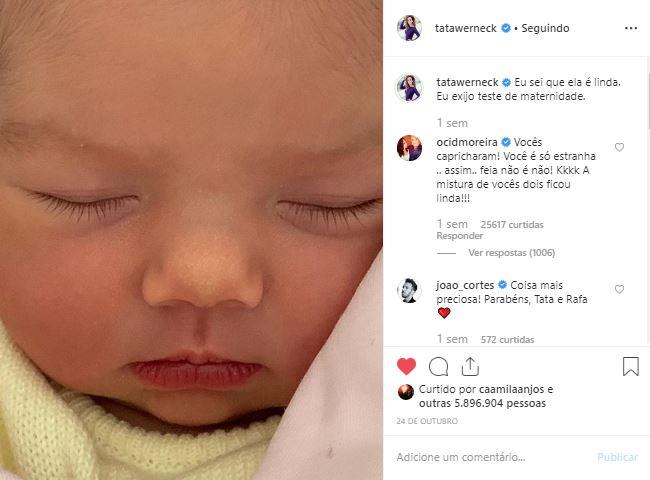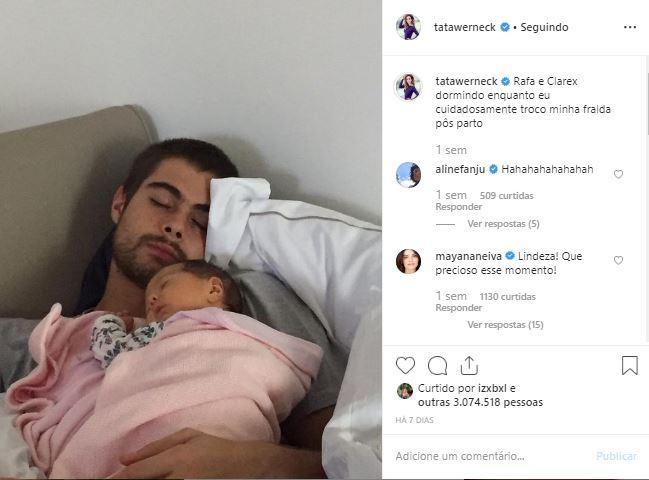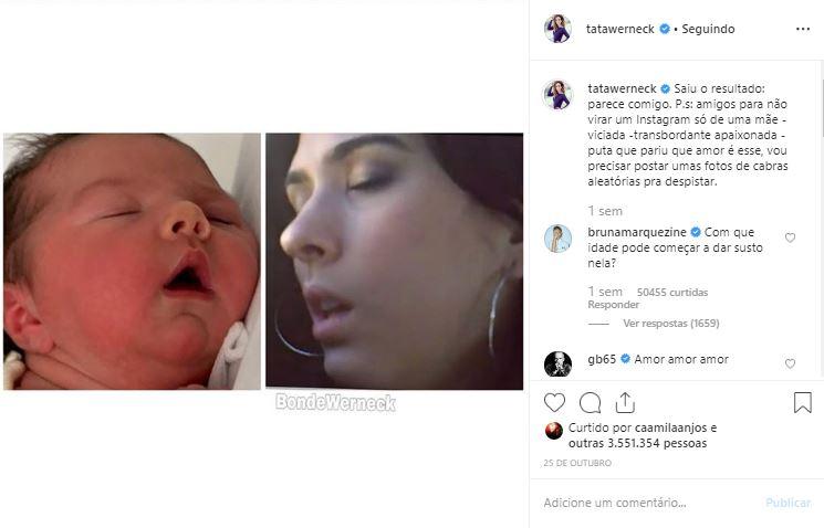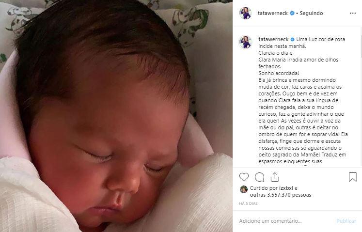 • Desde o nascimento de Clara Maria a internet já amou a primeira publicação de Tatá Werneck que rendeu mais de 7 milhões de curtidas no Instagram.