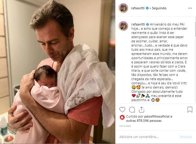 • Clara Maria comemorando o aniversário do pai, Rafael Vitti, no colo dele