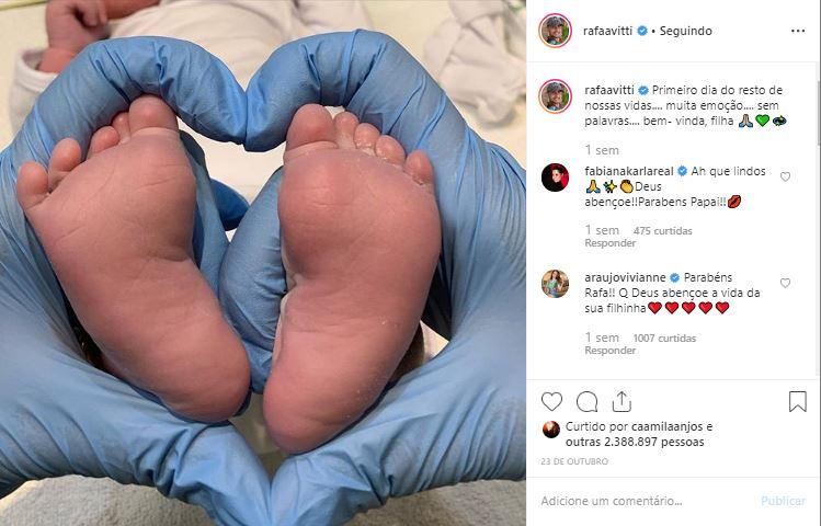 • Rafael Vitti também publicou a primeira foto no Instagram e os pés gordinhos de Clara aqueceram nosso coração!