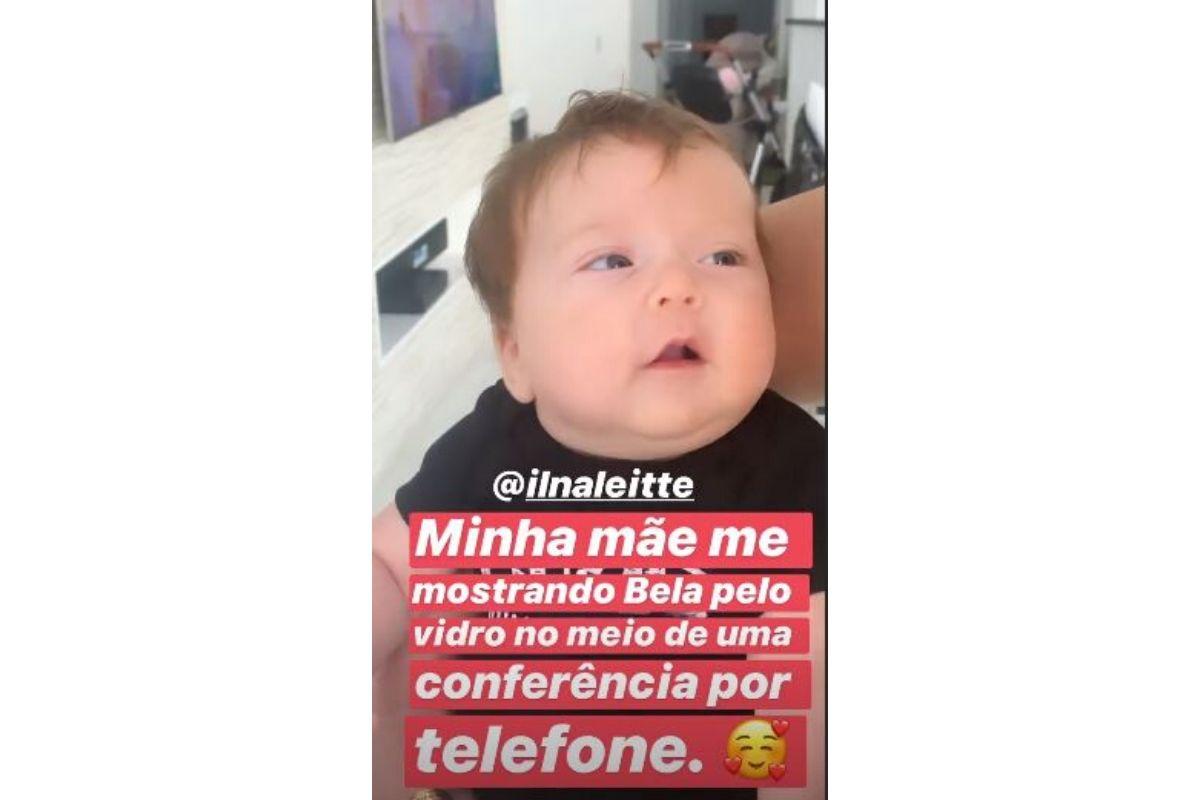 “Minha mãe me mostrando Bela pelo vidro no meio de uma conferência por telefone“, disse Claudinha sem perder o bom humor. Alguns fãs da cantora ficaram impressionados com o tamanho de Bela, que tem apenas 2 meses.