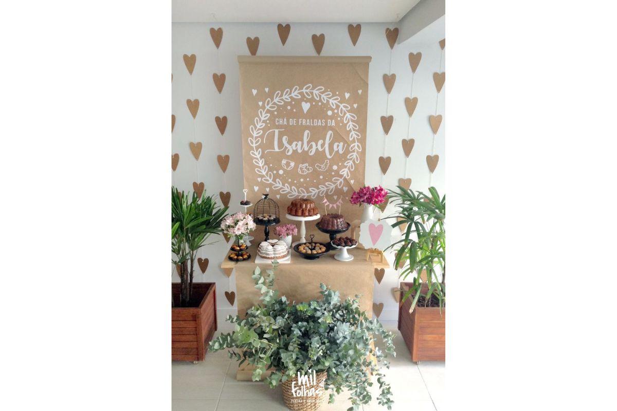 A decoração escolhida para esse chá de fraldas é extremamente simples – mas, mesmo assim, extremamente charmosa e marcante. Ela é inteira feita em papel kraft e enfeitada com lettering em tinta branca. As linhas de nylon também foram enfeitadas com coração do mesmo material. Para finalizar, a mesa de doces e salgados da festa é pequena, mas bem decorada com boleiras estilosas.