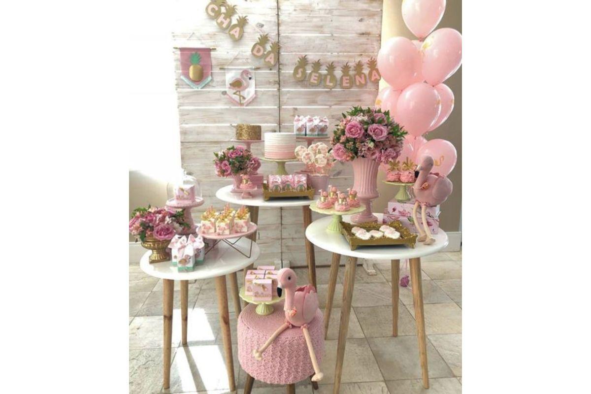 Há alguns anos, os flamingos passaram a ser um tema de decoração de quartos e festas de criança com uma certa frequência. Não é para menos: o resultado é sempre algo com cara de fofo e divertido ao mesmo tempo. Aqui, as bexigas e vasos com rosas criaram volume nas mesas pequenas, que ganharam um bolo lindo com vários tons de rosa. Para finalizar, pelúcias de flamingo fecharam a escolha da décor com chave de ouro.