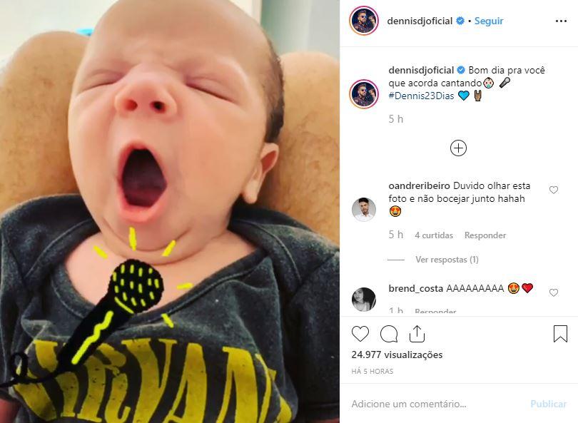 Na publicação, o menino Dennis está bocejando e o pai colocou gifs de microfone, como se o bebê estivesse cantando: “Bom dia pra você que acorda cantando”, disse o DJ.