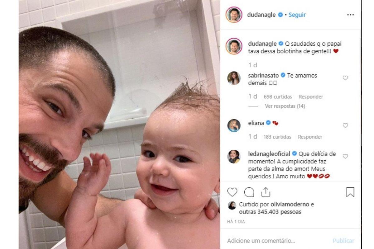 Ele ainda usou a legenda para se declarar: “Que saudade que o papai estava dessa bolotinha de gente!”, escreveu. Nos comentários, Sabrina disse também declarou seu amor, enquanto Leda Nagle escreveu: “Que delícia de momento! A cumplicidade faz parte da alma do amor! Meus queridos! Amo muito”.