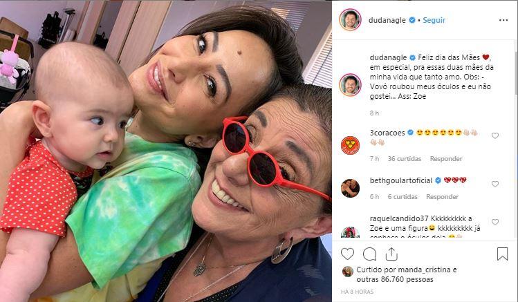 “Feliz Dia das Mães em especial para essas duas mães da minha vida que amo tanto”, disse Duda. “Obs: Vovó roubou meus óculos e eu não gostei. Assinado: Zoe”.