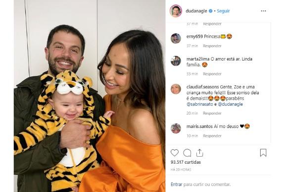 Na foto, o ator aparece ao lado da esposa, Sabrina Sato, com a bebê no colo. Zoe aparece com um sorriso largo usando um macacão de animal. “Que tigresa mais linda! Amo muito minha família”, escreveu o pai na legenda.