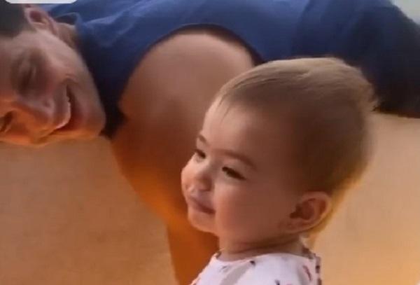 Na gravação, feita por Sabrina Sato, a menina ainda brinca de acordar o pai com beijinhos.