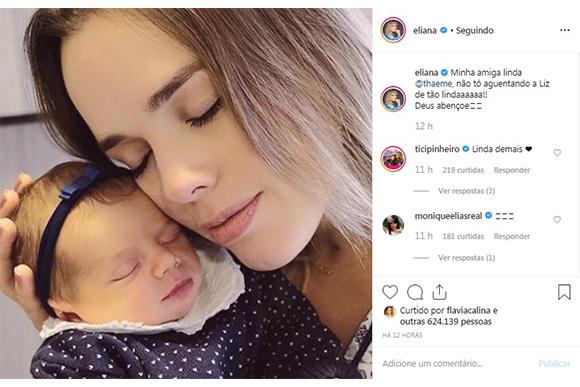 A apresentadora Eliana, mãe de Manuela e Arthur, é muito próxima da cantora Thaeme. Na última segunda-feira, 22 de abril, Eliana publicou uma foto de Thaeme com a filha Liz e expressou a felicidade que sentia pela conquista da amiga: sua primeira filha.