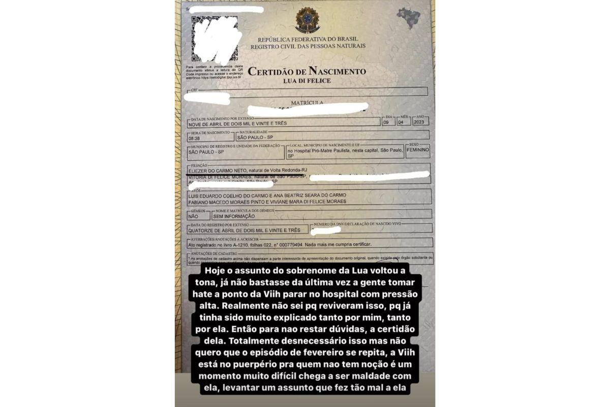 “Então para não restar dúvidas, a certidão dela. Totalmente desnecessário isso mas não quero que o episódio de fevereiro se repita, a Viih está no puerpério pra quem não tem noção é um momento muito difícil, chega a ser maldade com ela, levantar um assunto que fez tão mal a ela”, finalizou Eliezer.