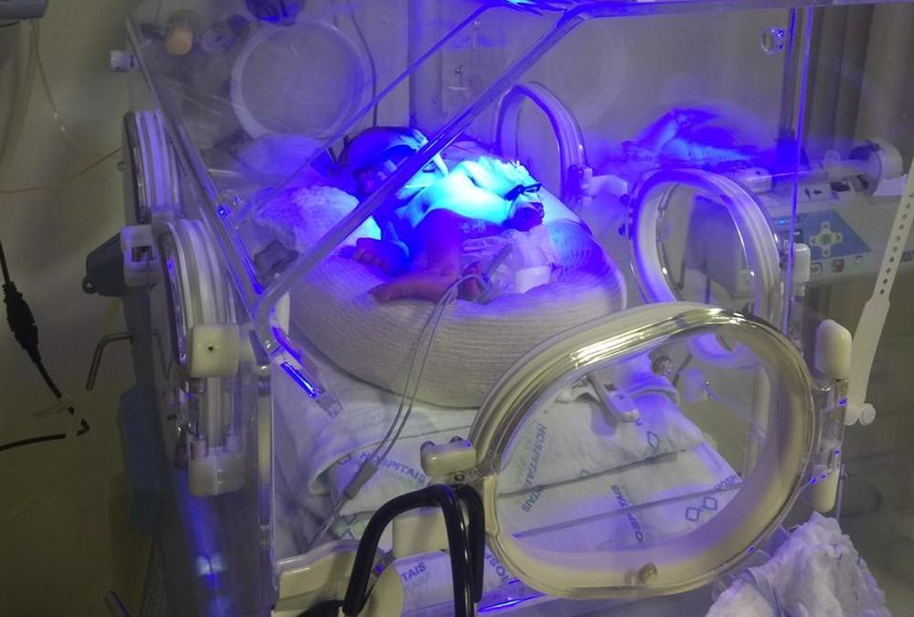 Rebeca, prematura de 33 semanas, foi levada para a incubadora da UTI neonatal. A mãe foi mantida na sala de parto por mais algumas horas aguardando que a outra filha, Martina, nascesse.