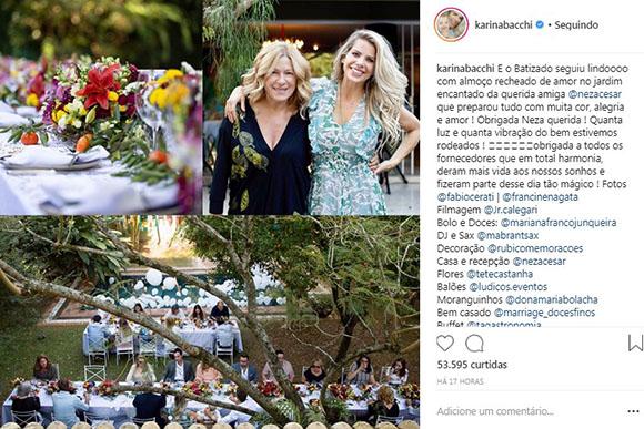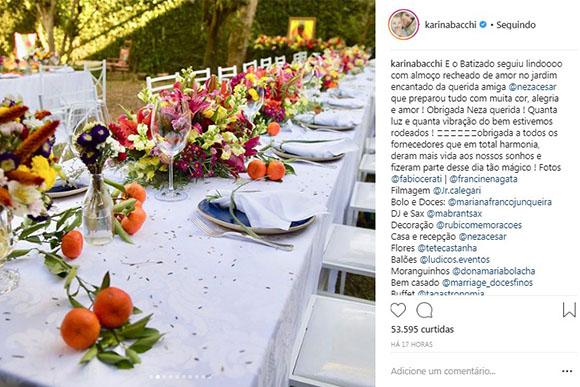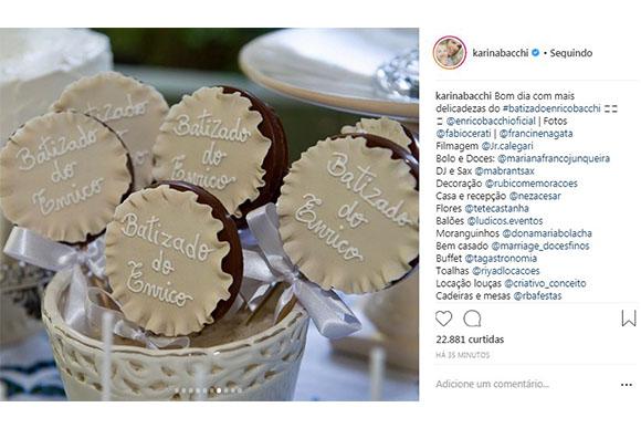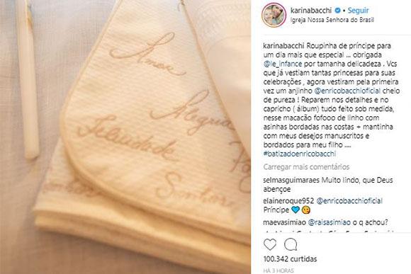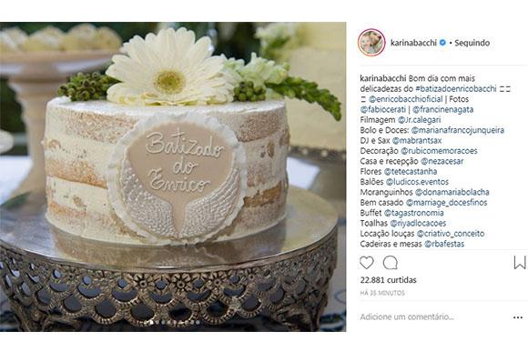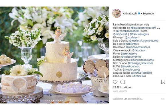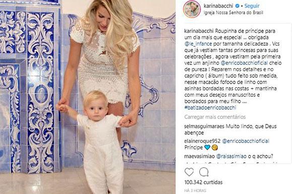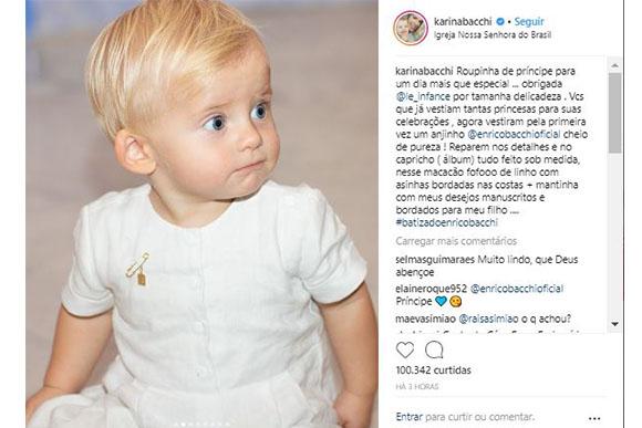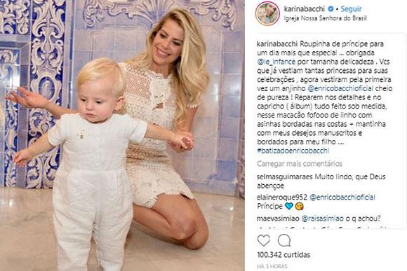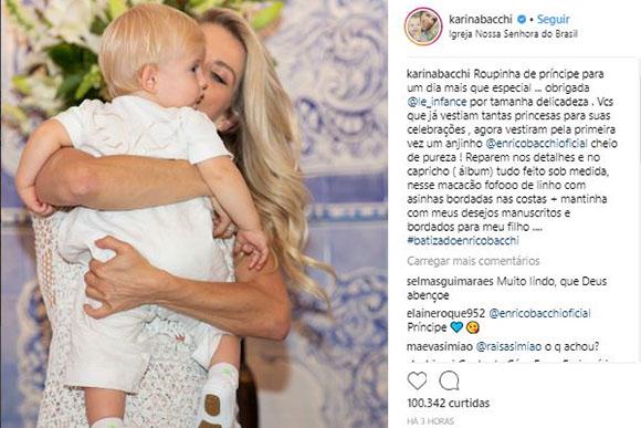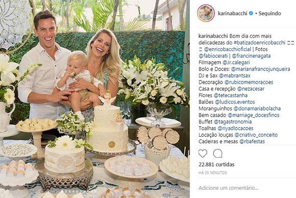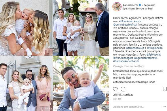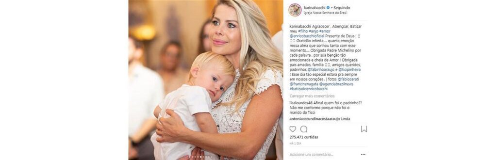 No último domingo (8), pela manhã, aconteceu o batizado do primeiro filho da Karina Bacchi, Enrico. A atriz não economizou fotos e publicou vários registros do momento superespecial em família no Instagram @karinabacchi. Com a apresentadora Ticiane Pinheiro como madrinha, Karina agradeceu a Deus pela oportunidade de ser mãe. “Agradecer, abençoar e batizar meu filho, presente de Deus! Gratidão infinita… Quanta emoção nessa alma que sonhou com esse momento”, escreveu a mãe. Cada publicação conquistou mais de 100 mil curtidas. Todo mundo desejando o melhor para o menino, separamos várias fotos para você: