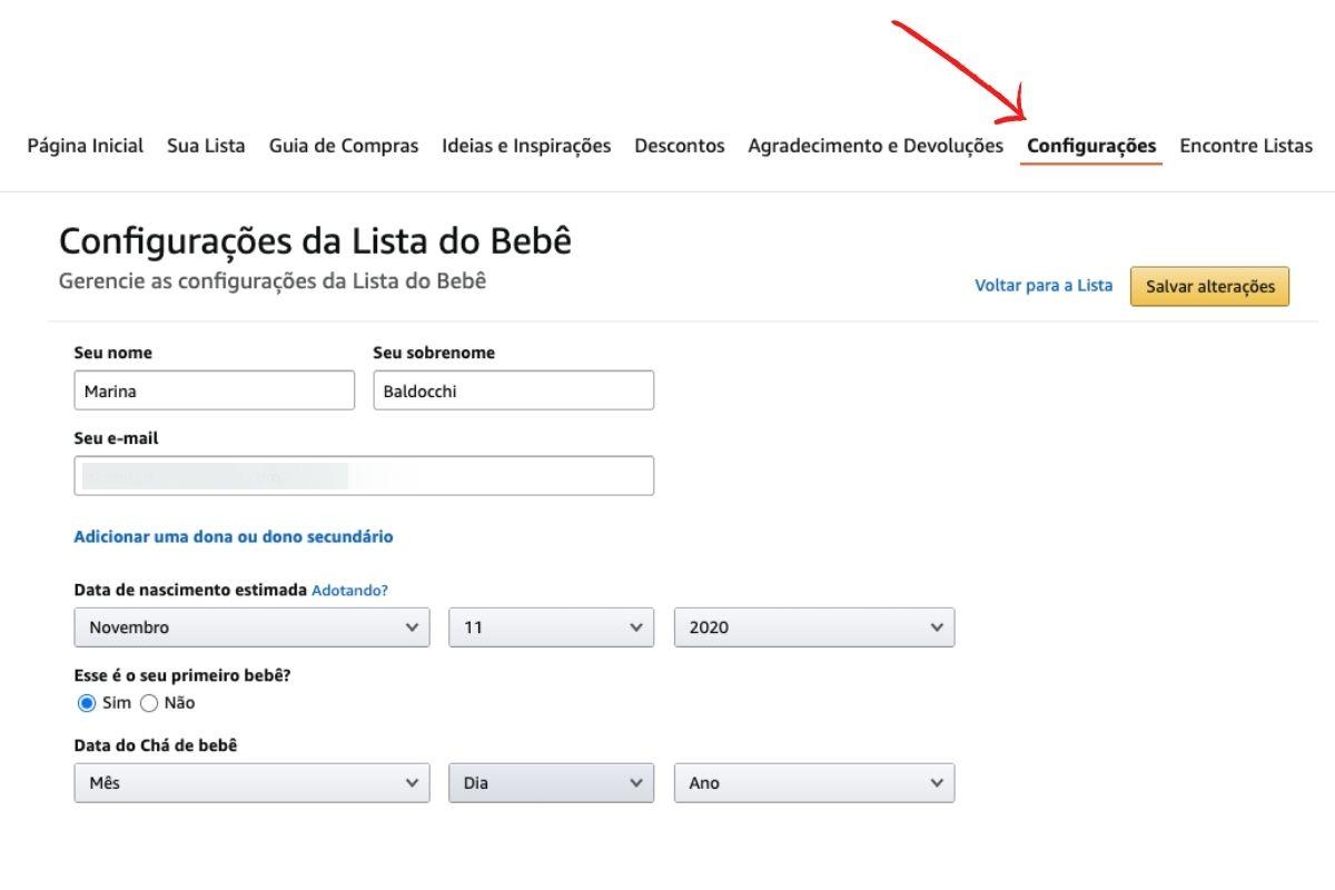 Agora, você terá acesso ao portal da sua lista de bebê, com várias sugestões de produtos essenciais e com descontos, além de ideias e inspirações. No menu no topo da página, ainda há uma aba de configurações – ao clicar nela, você pode escrever uma mensagem para amigos e familiares, como mostramos abaixo, e descrever, por exemplo, as cores do quarto, o sexo do bebê e preferências de produtos.