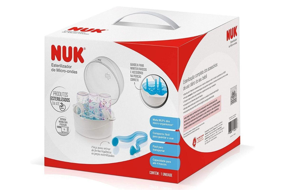 O esterilizador da Nuk mata 99,9% dos microrganismos, além de ser compacto e fácil de guardar e usar, você pode levar para qualquer lugar. Nele, cabem até quatro frascos de bocal largo que podem ser esterilizados em até 3 minutos na potência máxima. Para comprar na Amazon, é só clicar AQUI.