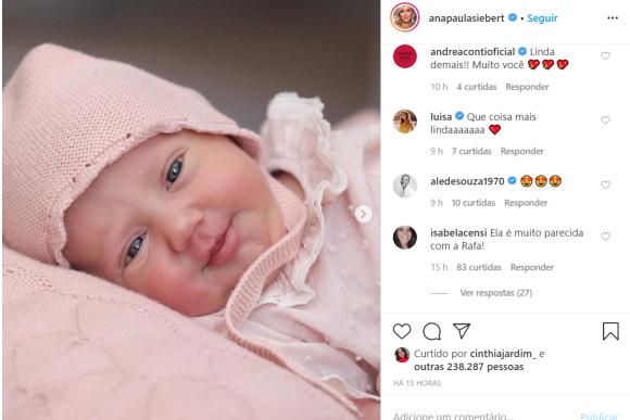 Também teve fã dividido: “Os traços são parecidos. A Vicky é uma misturinha linda da Rafa e da mamãe”. Outros afirmaram que Vicky é a cara da mãe: “Linda demais!! Muito você 💖💖💖”.