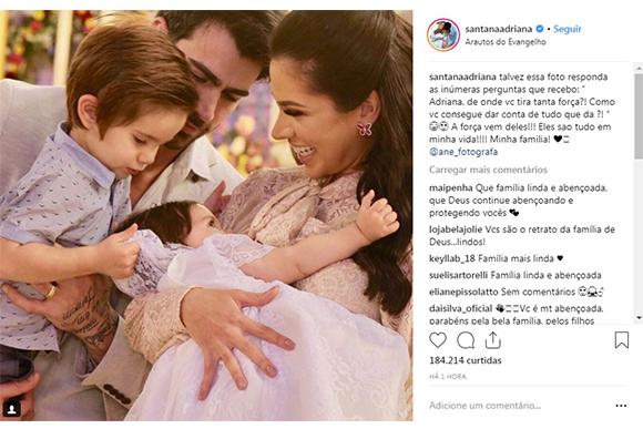 Linda nasceu no dia 15 de janeiro, é a segunda filha do casal. “Você é a bonequinha de porcelana da vida da mamãe, do papai e do irmãozinho! Te amamos muito!”, disse Adriana na legenda da foto. A imagem foi publicada em comemoração ao batizado da menina, que tem 7 meses. Eles também são pais de Rodriguinho, de 2 anos.