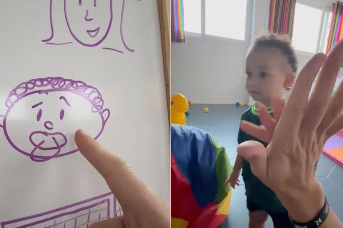 Em um vídeo publicado na rede social, ele aparece ensinando para o bebê o nome de objetos. O pai desenhou em uma mini lousa escolar um pé, bola, chupeta, gol, o time de futebol palmeiras, sol e até chegou a fazer um retrato próprio e o de Bianca para Cris identificar o nome de cada coisa. “Escolinha do popói”, brincou Fred na legenda da publicação.