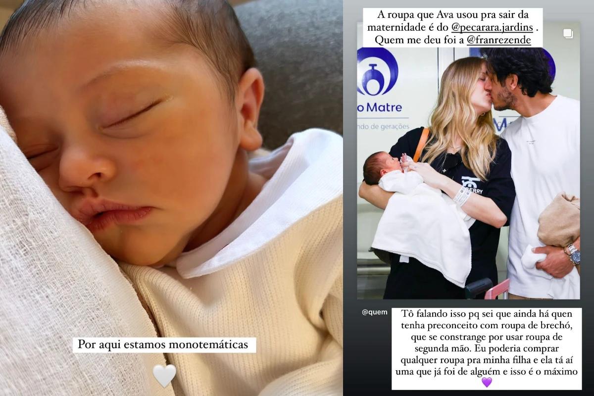 Na rede social ela falou: “A roupa que Ava usou para sair da maternidade é do [brechó] Peça Rara Jardins. Quem me deu foi a @franrezende” e ainda detalhou os motivos de estar explicando isso: “Estou falando porque sei que ainda há quem tenha preconceito com roupa de brechó, que se constrange por usar roupa de segunda mão. Eu poderia comprar qualquer roupa para minha filha e ela está aí com uma que já foi de alguém e isso é o máximo”.