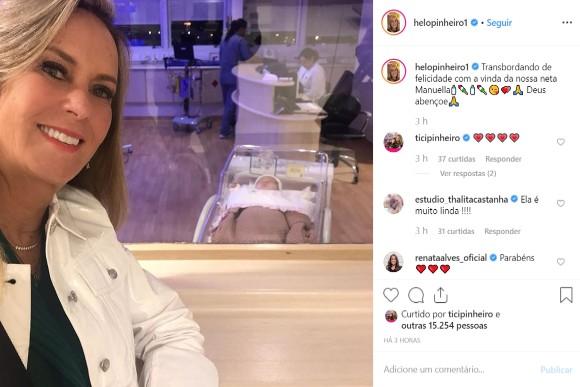 A Manuella, filha de Ticiane Pinheiro e César Tralli, nasceu na tarde desta sexta-feira (12) e Helô Pinheiro fez questão de tirar uma selfie com a neta e compartilhar com os seguidores nas redes sociais. “Transbordando de felicidade com a vinda da nossa neta Manuella. Deus abençoe”, escreveu na legenda.