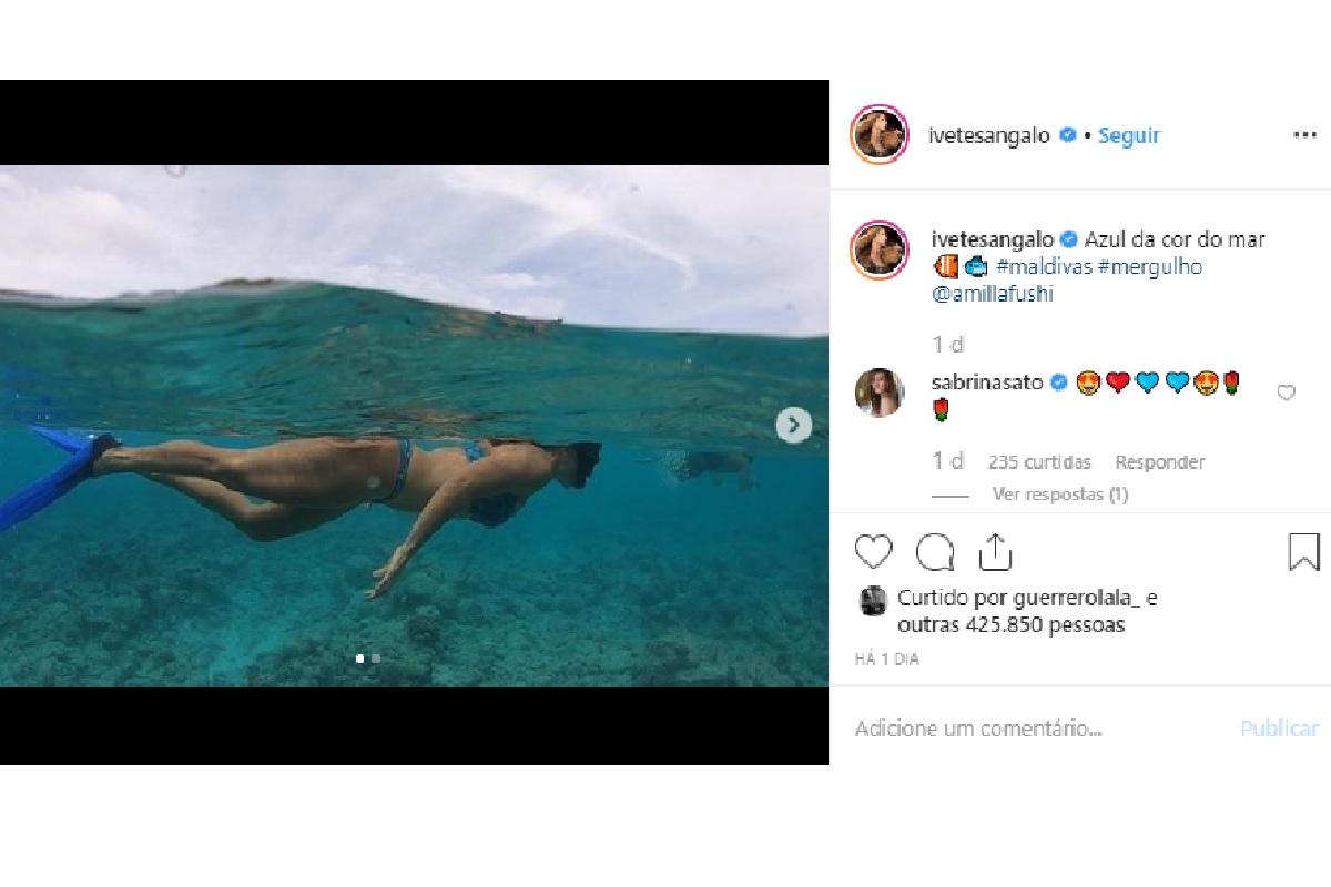 “Zzul da cor do mar #maldivas #mergulho”, escreveu na publicação. Nos comentários, chuva de elogios. “Sereia”, disse uma amiga de Veveta. “Musona”, escreveu Cris Vianna. “SE BELEZA FOSSE GRÃO DE AREIA VOCÊ SÉRIA MEU DESERTO DO SAHARA”, brincou um fã clube.