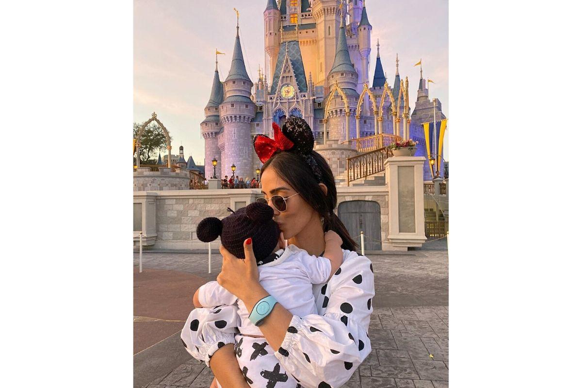 Mãe e filho aparecem abraçados em frente ao castelo da Cinderela e enquanto Jade aparece usando uma tiara de Minnie, Zion está com uma toca de Mickey. Muito fofos, né?